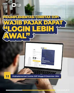Untuk memberikan kemudahan pada saat implementasi, dalam masa praimplementasi ini, Wajib Pajak dapat melakukan log in ke sistem Coretax DJP mulai hari Selasa tanggal 24 Desember 2024. Coretax DJP dapat diakses oleh wajib pajak yang telah memiliki akun DJP Online pada tautan pajak.go.id.